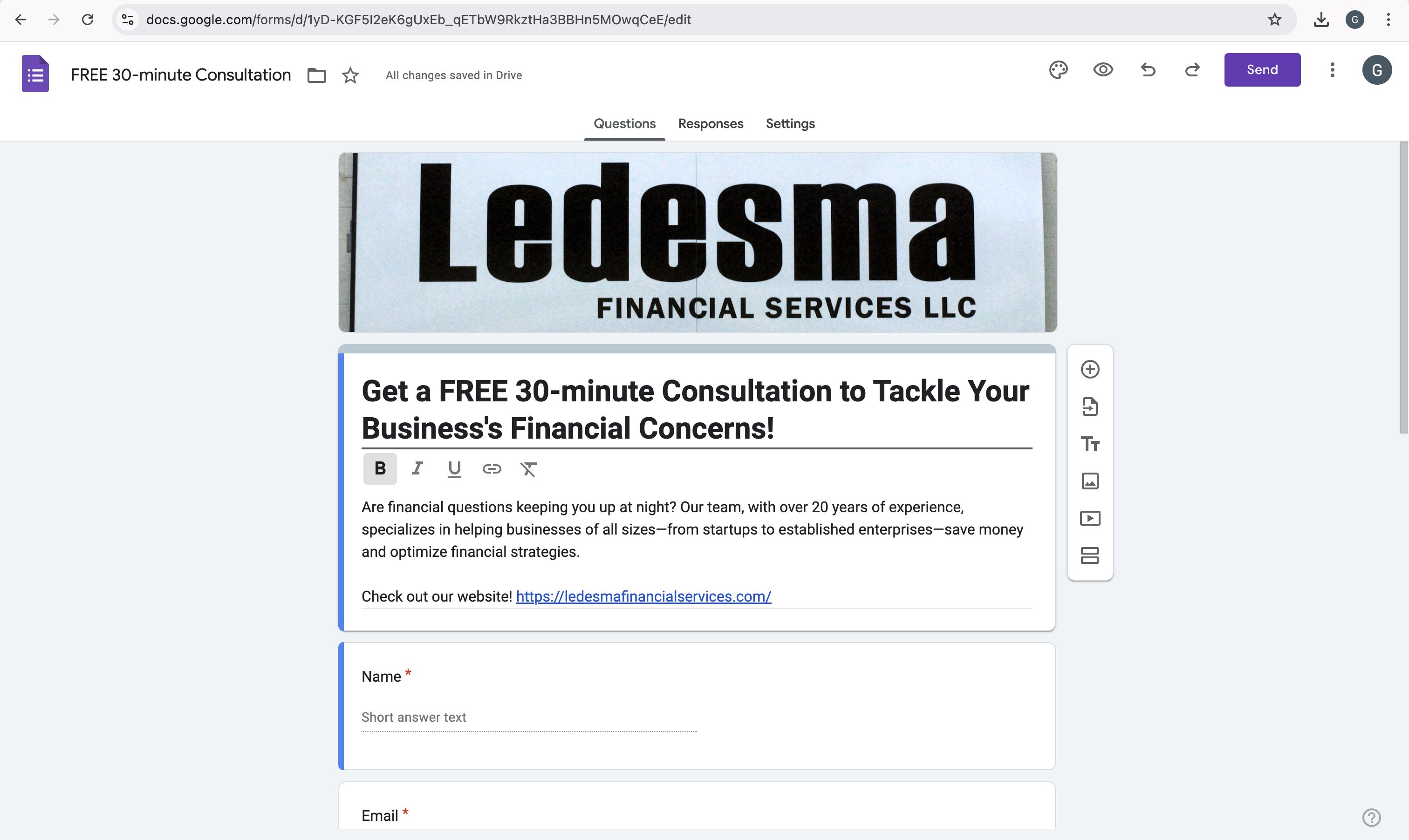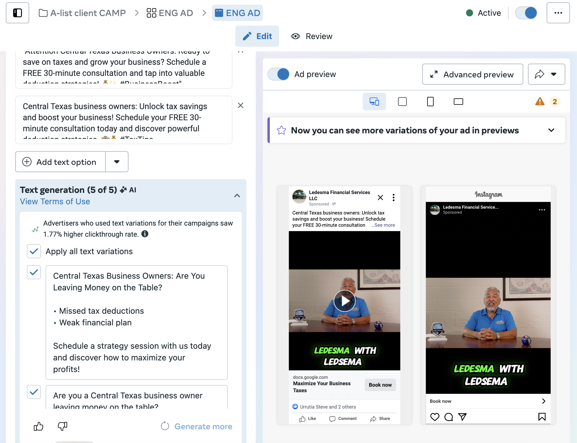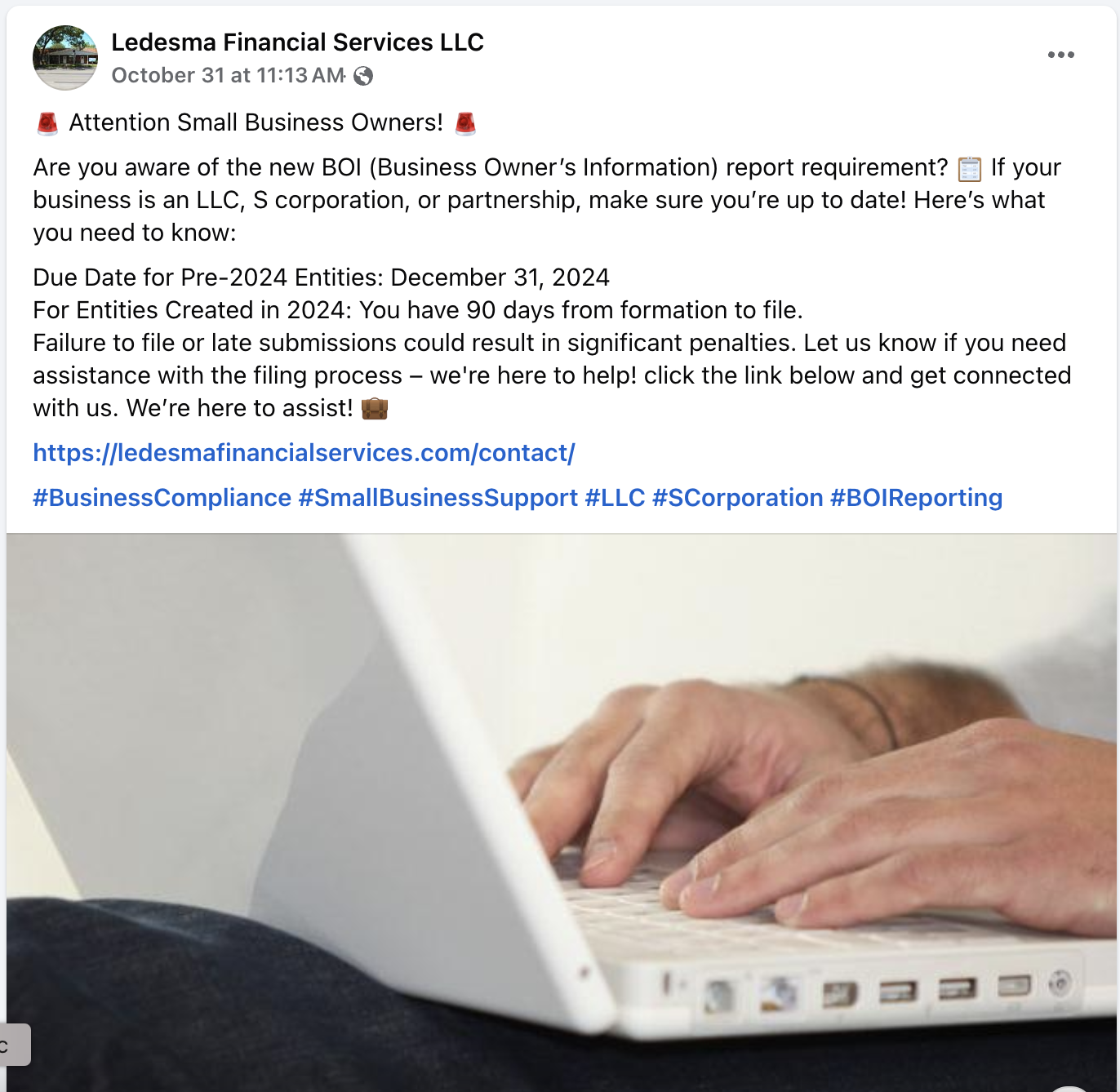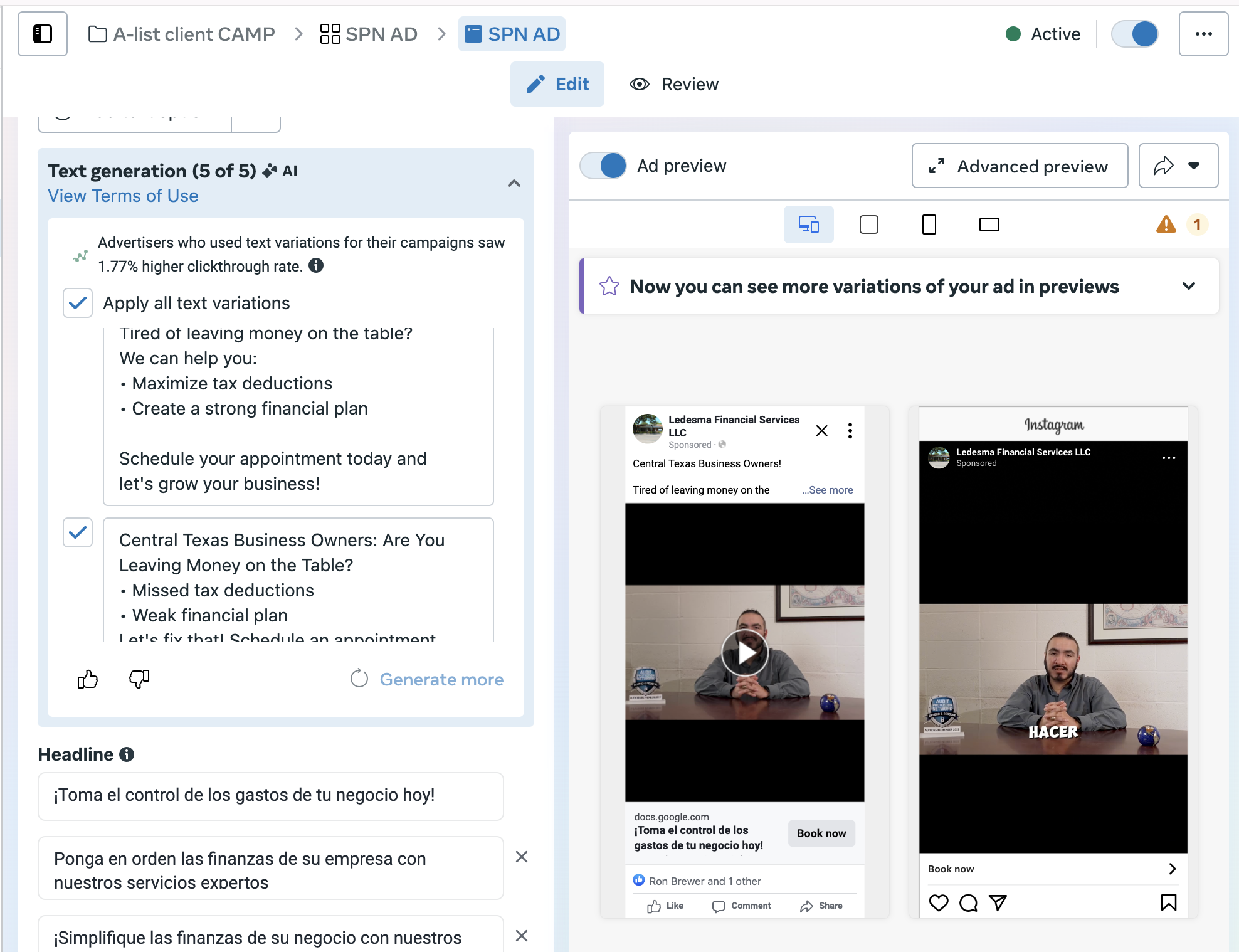I partnered with Ledesma Financial Services LLC, a newly established company, to elevate their marketing strategy and increase brand awareness among business owners in Central Texas, including Spanish-speaking entrepreneurs. By addressing key pain points and highlighting the value of professional financial services, I developed a comprehensive campaign designed to increase visibility, engagement, and conversions. The strategy included optimizing their website with a user-friendly landing page, revamping their Facebook presence, and launching targeted Meta ads to reach their ideal audience. This localized approach not only positioned Ledesma Bookkeeping LLC as a trusted, bilingual service provider but also aimed to foster meaningful client relationships while achieving measurable KPIs such as impressions, clicks, and conversions over a six-month period.